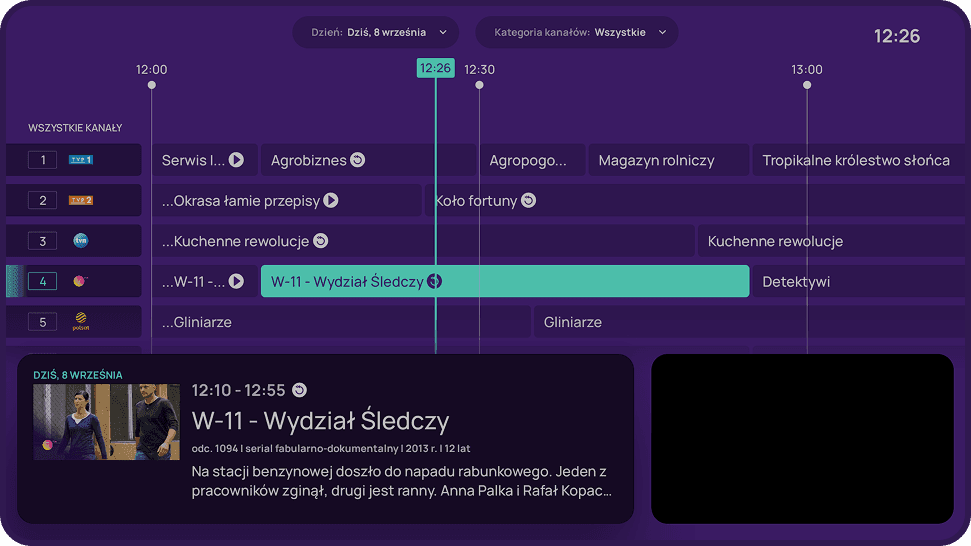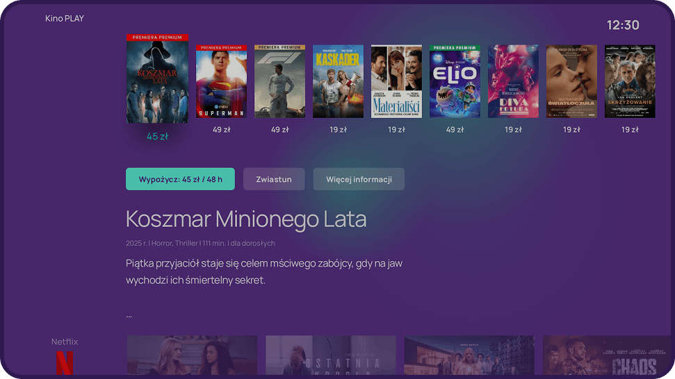 Masz do dyspozycji powierzchnie promocyjne na ekranie głównym, gdzie możesz umieszczać dynamiczne upselle (pakiety, PPV, sport), sezonowe akcje sprzedażowe oraz reklamy różnego typu (AVOD/FAST, własne kampanie). Precyzyjne targetowanie i śledzenie konwersji wiążą zaangażowanie użytkowników bezpośrednio z ARPU – bez wspierania cudzej platformy.